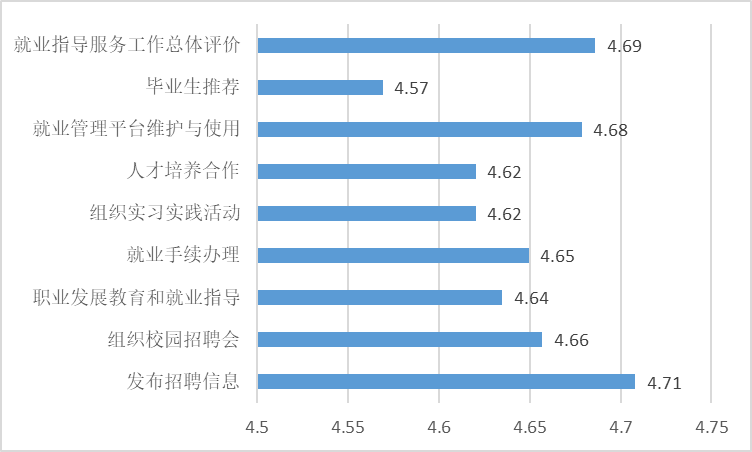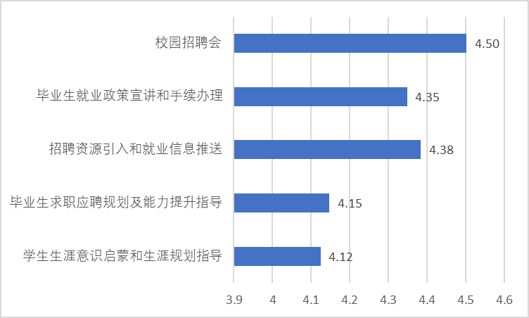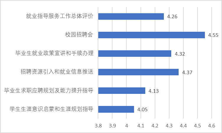 在参与问卷调查的2021届毕业生中,对学校职业指导与就业服务工作的评价较好,最满意的是校园招聘会以及招聘资源引入和就业信息推送,而对学生生涯意识启蒙和生涯规划指导和毕业生求职应聘规划及能力提升指导满意度相对较低,后续学院应当在这一部分对学生加强指导。