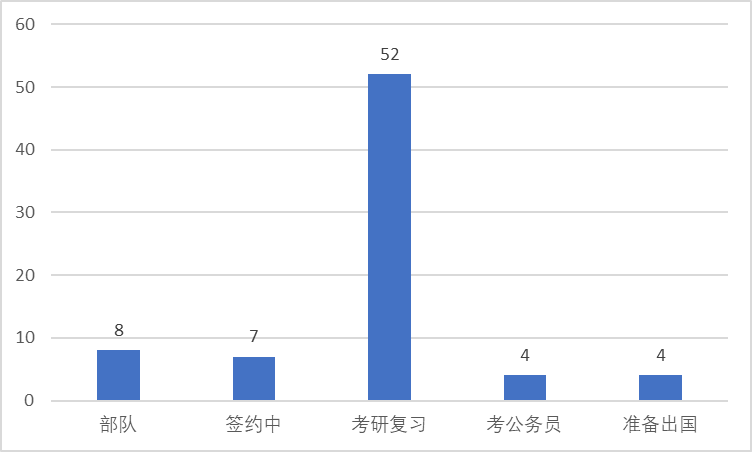 爱游戏ayx体育2021届毕业生中未就业学生共75人,8人已考上军队文职或军官直招,公示期满正在培训中,未办理任何签约手续。7人目前正在办理签约手续中,52人在准备复习考研,没有就业意愿;4人在准备公务员、事业单位考试;4人准备出国。