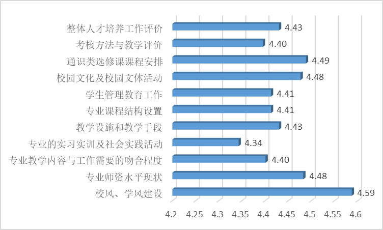 根据毕业生对学校教育教学工作的满意度调查(图33),毕业生对专业的实习实训及社会实践活动专业的满意度最低。所以,学校应调整教学课程安排,创新教学方法,积极加强与企业的联系,拓宽就业实习实训基地,让学生能够做到理论联系实践,增强毕业生整体就业力。