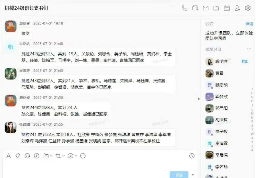 为实时掌握学生在校、离校动态,学院学工组执行假前晚归寝日汇报制度,每日23:00统计各年级晚归寝情况。