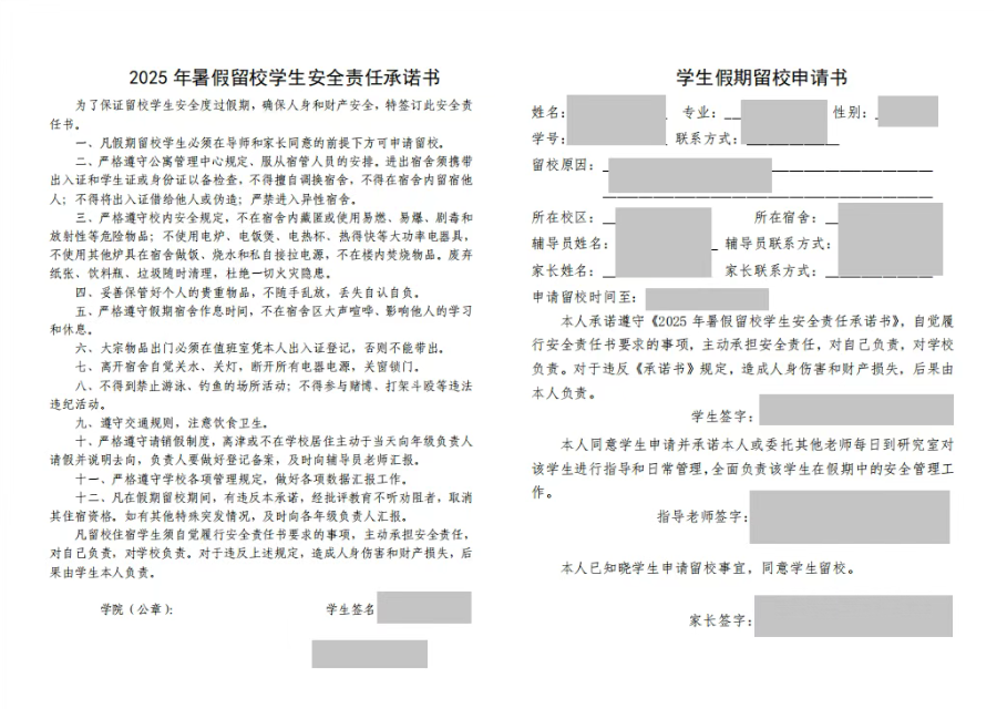 为明确学校和学生在假期留校住宿期间的安全责任与义务,保障学生的人身和财产安全,维护学校的安全稳定,学院组织留校学生签订《2025年暑假留校学生安全责任承诺书》,要求学生严格遵守学校相关要求,承诺自觉履行安全责任书要求的事项,做校园安全的践行者。